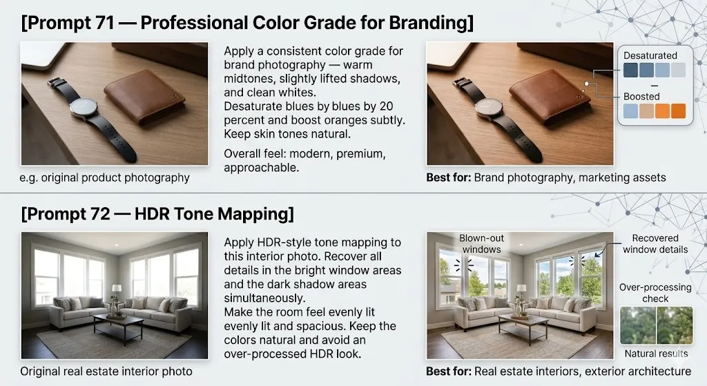 Apply a consistent color grade for brand photography — warm midtones, slightly lifted shadows, and clean whites. Desaturate blues by 20 percent and boost oranges subtly. Keep skin tones natural.These ten prompts cover the most common editing needs: portraits, backgrounds, exposure, products, color grading, and object removal. Each one is designed to work on the first try with minimal customization.