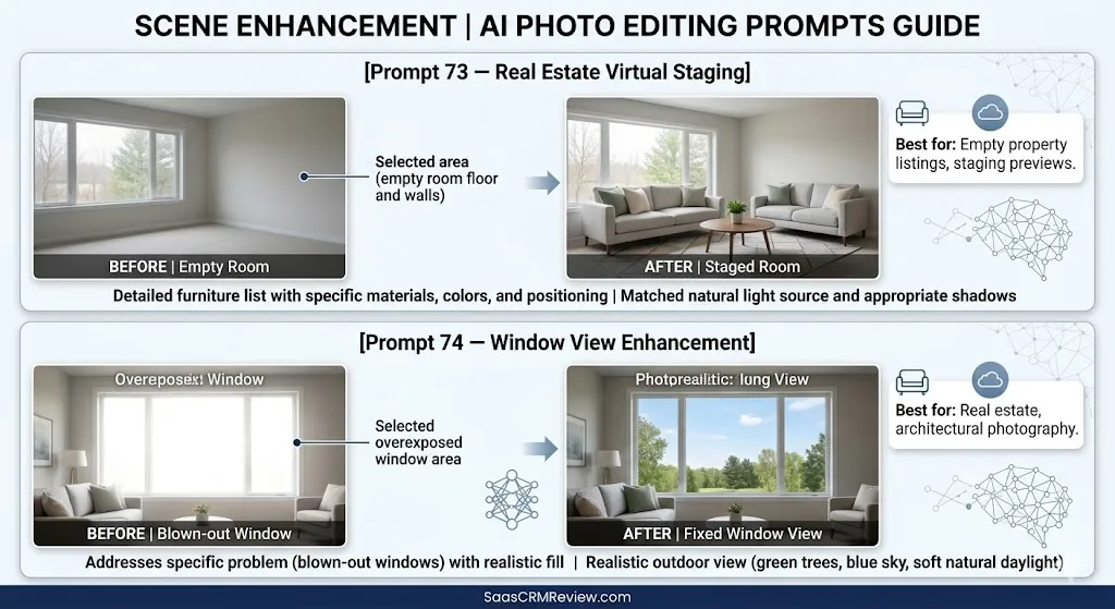 Real estate edits benefit from a multi-tool approach. Use Gemini for quick sky replacement (Prompt 27) and exposure correction (Prompt 28). Use Firefly for virtual staging (Prompt 73) and window view enhancement (Prompt 74). Use ChatGPT for interior declutter (Prompt 8) and seasonal changes (Prompt 18).