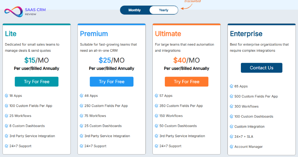 Quick answer: Apptivo CRM starts at $20/user/month (billed monthly) or $15/user/month (billed annually), with higher tiers at $30 → $25 and $50 → $40 per user/month. No contract and no credit card required to start a trial.