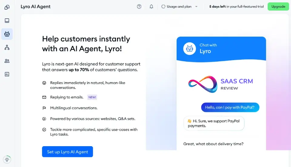 16Tidio LyroSMB supportYes$39Web widget, ShopifyShopify, emailGDPR ready7.8