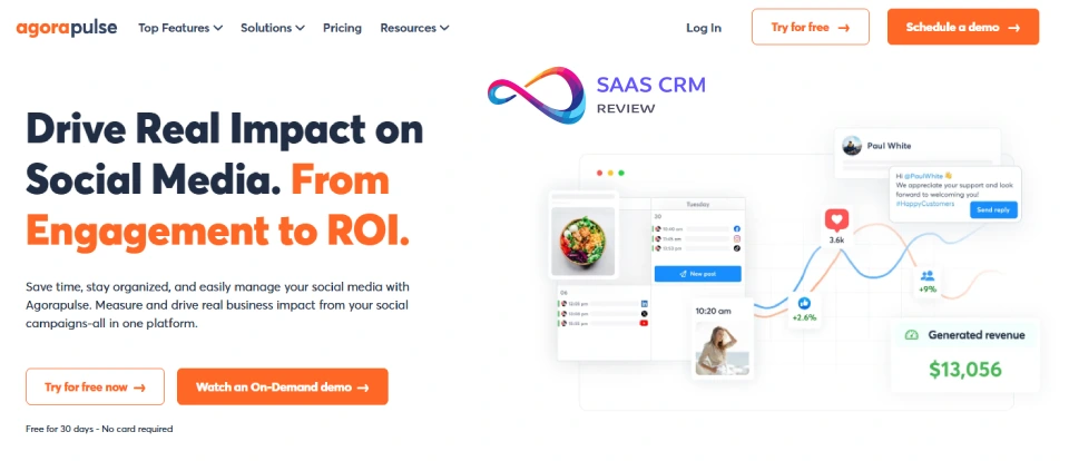 | Agorapulse | SMB social engagement | Native (social hub) | FB, IG, X, LinkedIn, YouTube, TikTok | Good (for social) | Limited CRM sync | Good | Good (social) | Limited CRM depth | $69/user/mo |