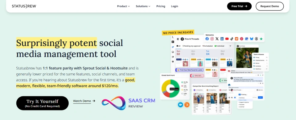 | Sprout Social | Social-first marketing/service | Native (social hub) | FB, IG, X, LinkedIn, Pinterest, TikTok, YouTube | Excellent (for social) | Via CRM sync (depends on connector mapping) | Excellent | Excellent (social) | Not a full CRM | $249/seat/mo |
