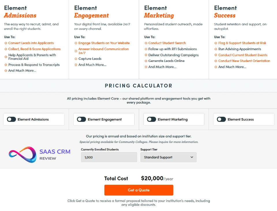 Positioning: Element Core ensures every package includes foundational CRM and engagement tools—Element451 emphasizes “transparent pricing” (per their pricing page) by bundling core functionality rather than nickel-and-diming for basic features.
