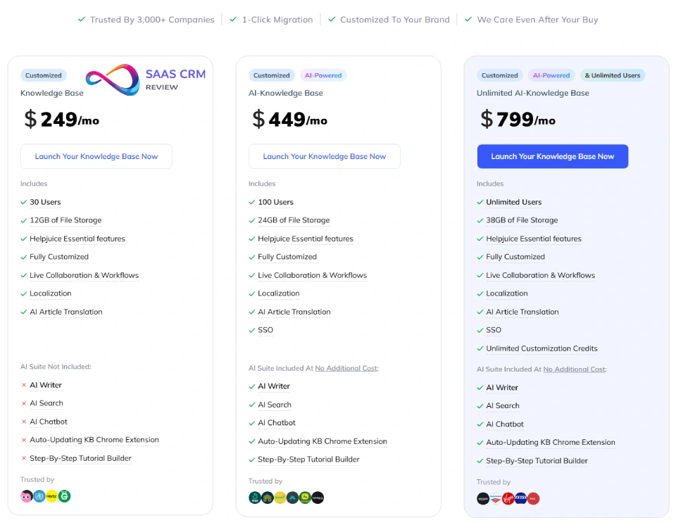 - Best for 30–100 users needing SSO + AI search: Helpjuice ($449/mo)