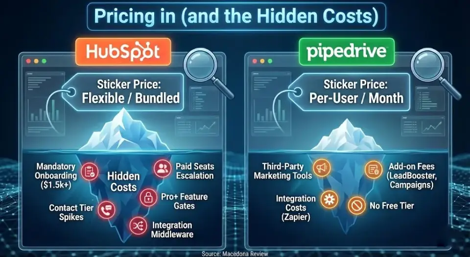 • Pricing page audits at HubSpot Sales Hub pricing and Pipedrive pricing, including add-on calculators and bundle simulators.