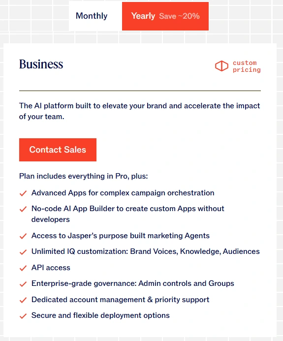 The Business plan is Jasper’s enterprise tier, built for marketing teams that need collaboration, security, and customization. Pricing is custom-quoted based on your requirements, but here’s what it typically includes: