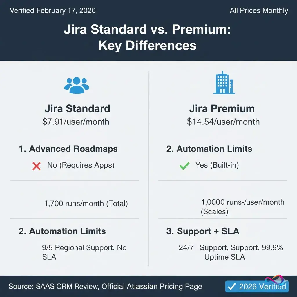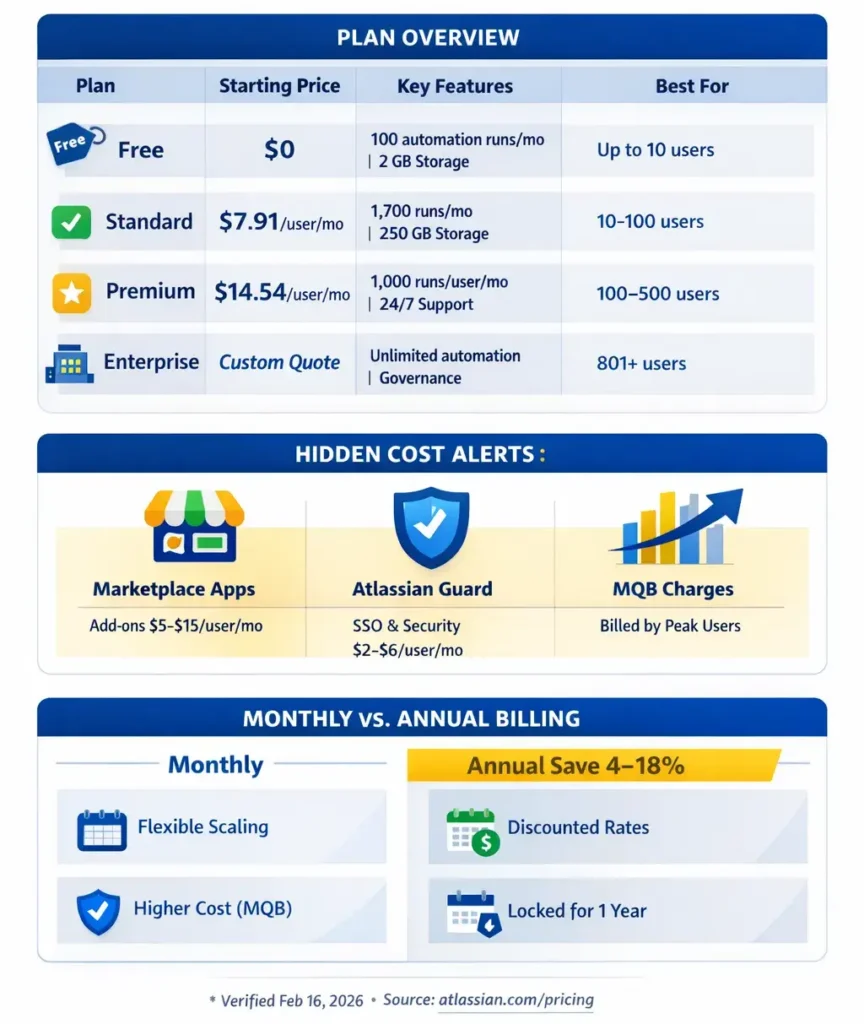 Prices verified February 16, 2026 from Atlassian official pricing page. Monthly billing rates shown; annual billing typically saves 4-18% depending on tier, though Premium has tier-specific exceptions (see detailed breakdowns below).