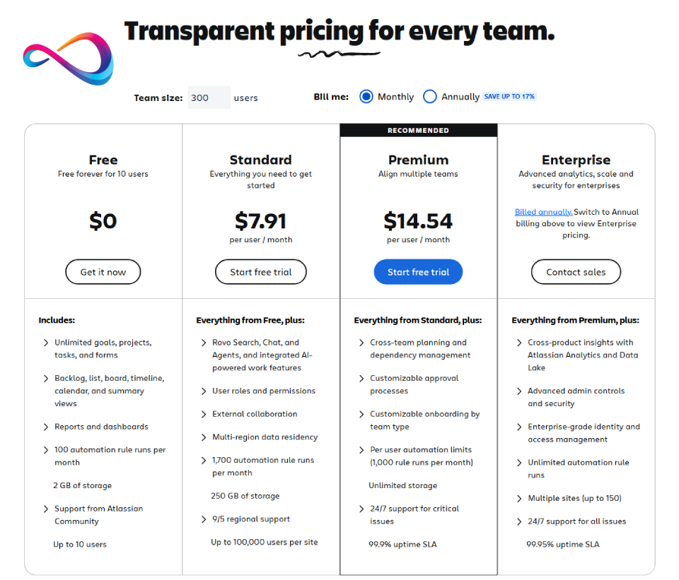 Choose your plan by: team size (Free ≤10, Standard 10–100, Premium 100+) + need for Advanced Roadmaps, unlimited automation, or 24/7 support.