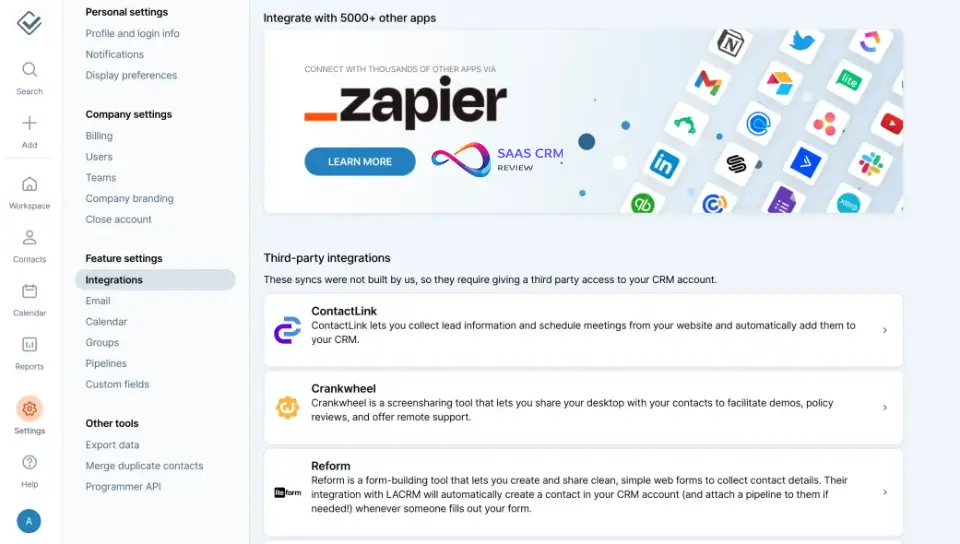 LACRM integrates natively with Google Workspace (Gmail, Calendar, Contacts). Microsoft Outlook integration is not natively supported—you would need Zapier or a third-party tool for Outlook connectivity.