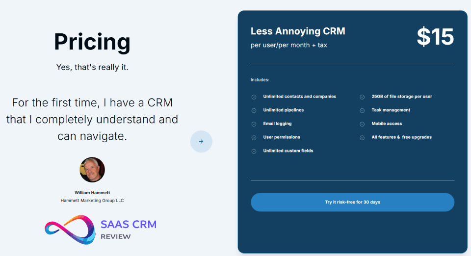 Less Annoying CRM costs $15 per user per month with no contracts, no hidden fees, and no price tiers. All features are included at this single price point. The company offers a 30-day free trial without requiring credit card information.