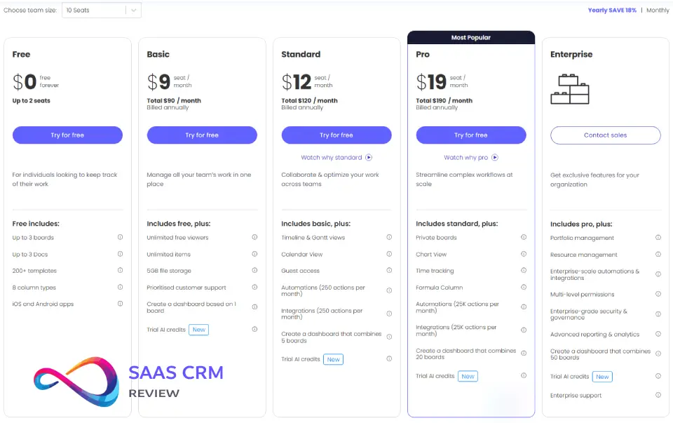 monday.com starts at $9/user/month (Basic) billed annually, but the Standard plan at $12/user/month is the practical minimum for useful features. Teams of 10 users pay $120-190/month depending on tier. Enterprise pricing is custom but typically ranges $25-35/user/month. All paid plans require minimum 3 seats.