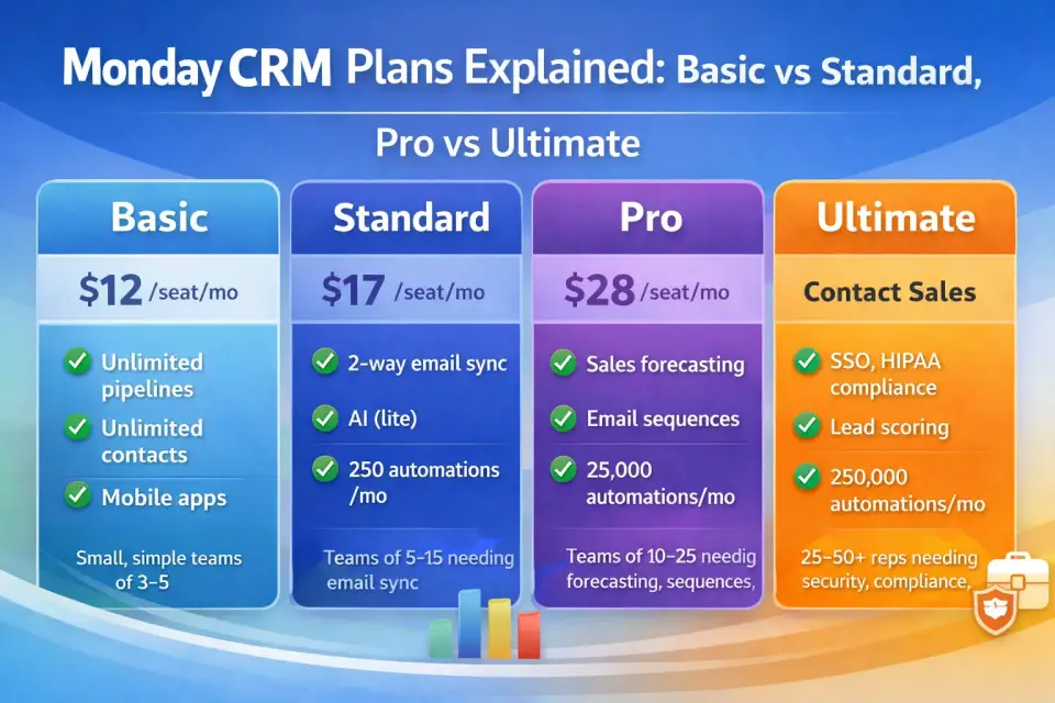 Monday.com CRM pricing starts at $12 per seat per month (billed annually) and scales across four tiers — Basic, Standard, Pro, and Ultimate (formerly Enterprise). This guide breaks down every plan, translates feature gates into real cost implications, and gives you a decision framework so you can select the right tier for your team size, workflow complexity, and budget.