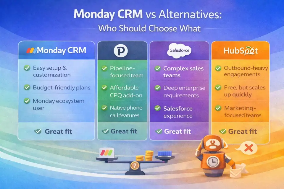 → Already using monday Work Management: Adding CRM creates the highest ROI through unified boards and cross-product reporting. Start with Standard and upgrade as needed.