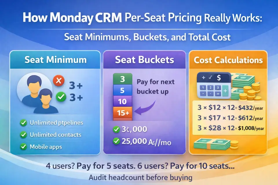 Monday.com CRM pricing follows a straightforward per-seat model, but the real cost depends on your team size, feature needs, and billing decisions. Key decision rules:
