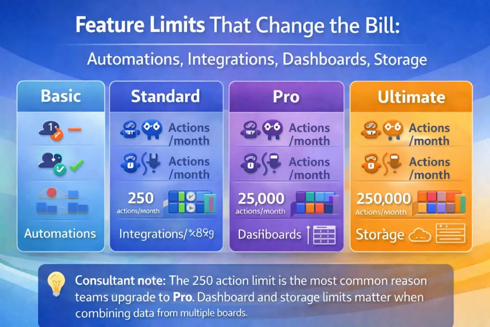Consultant note: The 250-action limit is the most common reason teams upgrade to Pro within 90 days. A single automation like “When deal stage changes, notify owner + update activity log” can consume 50–100 actions/month on a moderately active board. Three automations on a 10-rep team? You’re at the cap by week two.