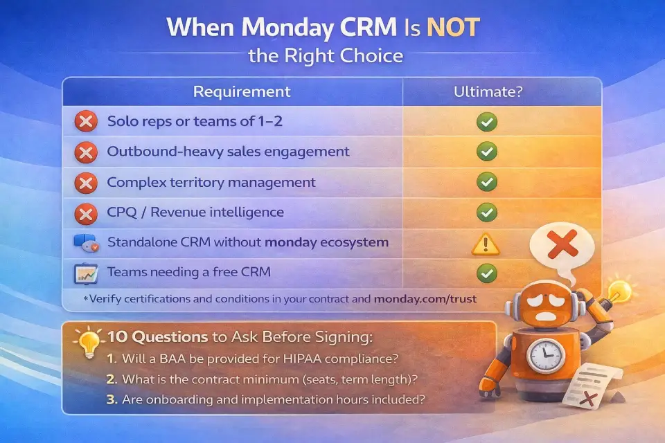 - Enterprise → Ultimate rename. monday.com rebranded its top CRM tier from “Enterprise” to “Ultimate.” Same features, new label. The official pricing page states: “Ultimate is a new name for our Enterprise tier.” If vendor reps say “Enterprise,” they mean Ultimate. (Source: monday.com CRM pricing page)