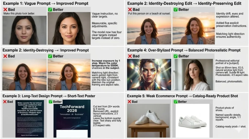 | Vague prompt (“make it look better”) | Unpredictable, generic output | Specify the exact change with measurable targets |
