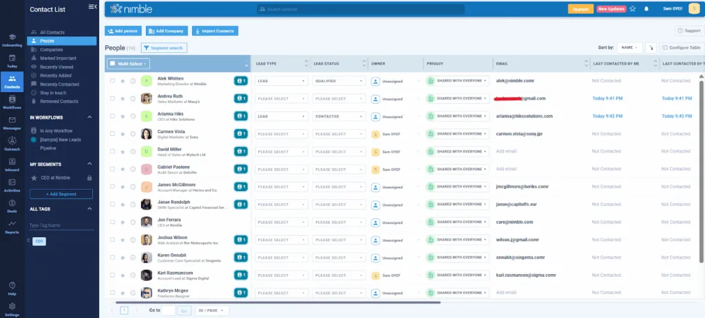 The distinction worth understanding early: Nimble is not a pipeline-first CRM. Products like Pipedrive (covered in our Pipedrive CRM review) are built around moving deals through stages. Nimble is built around knowing who you are talking to. It pulls social profiles, company data, and communication history into every contact record, so the relationship context is available before the sales conversation starts.