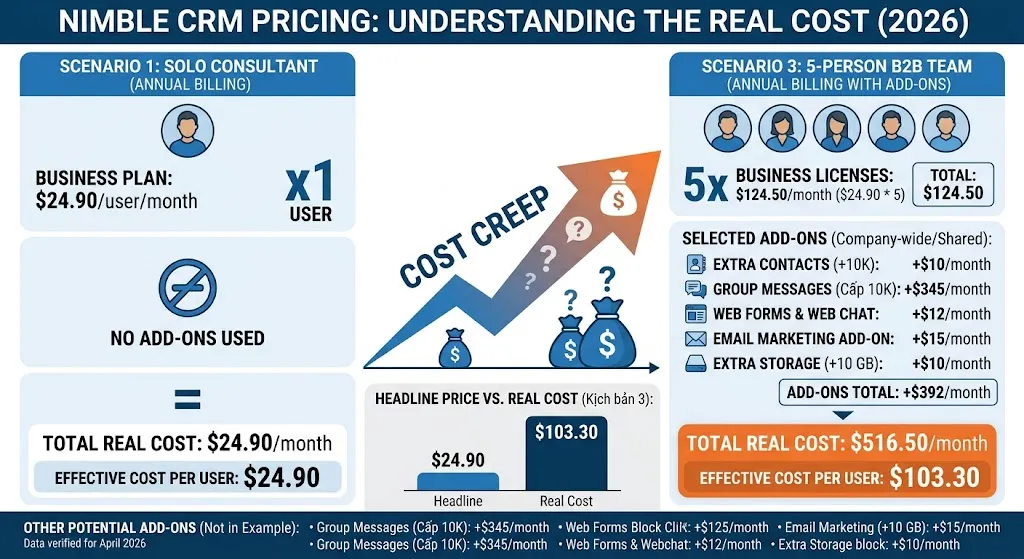 Nimble CRM costs $24.90 per user per month on annual billing, or $29.90 per user per month on monthly billing. Add-ons for group messaging ($15-$99/license/month), web forms ($12/month), email marketing ($15/month), extra contacts ($10/month per 10,000), and extra storage ($10/month per 10 GB) can increase the total cost. Pricing verified via Nimble’s official pricing page and support documentation, April 2026.