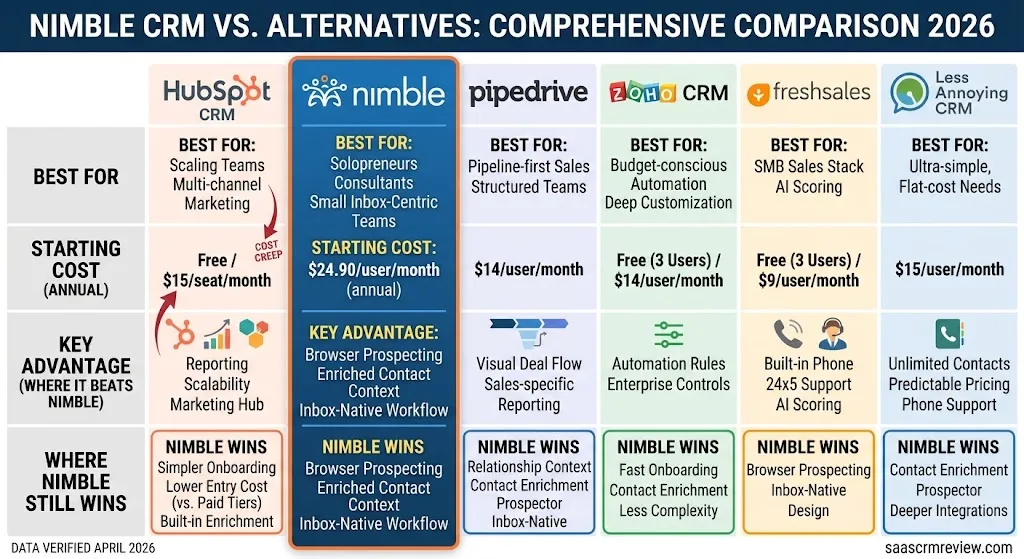 | Product | Best For | Starting Cost | Where It Beats Nimble | Where Nimble Still Wins |