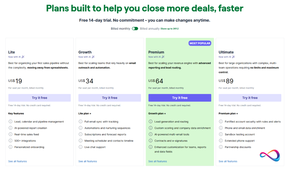 - AI features have expanded: the Sales Assistant AI (performance suggestions and deal scoring) is now available from the Lite plan. AI-powered reports are included on Lite. Premium adds increased AI for emails, custom scoring, and data enrichment.