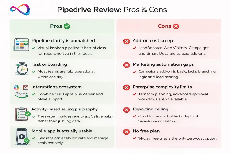If you’re looking for a Pipedrive CRM review in 2026, this guide gives you the decision fast: key features, real pricing (including add-ons), pros & cons, and the best alternatives—so you can quickly see whether Pipedrive fits your sales team and budget.