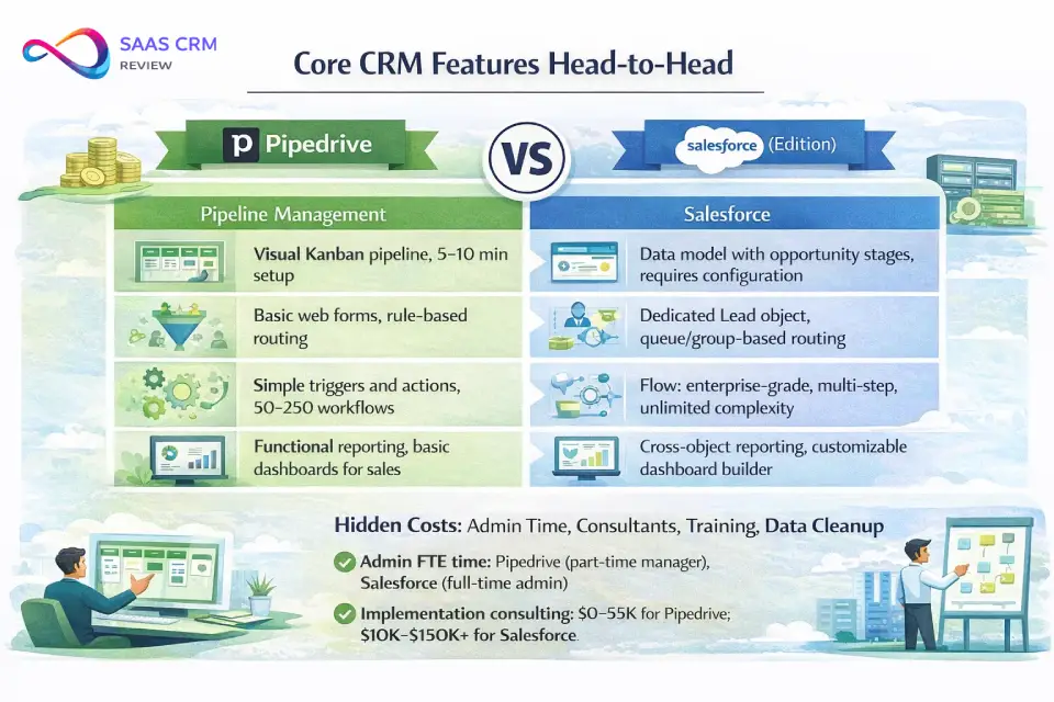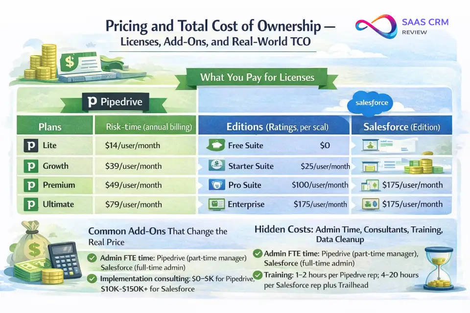 Which CRM is cheaper all-in? Pipedrive is significantly cheaper across both license cost and total cost of ownership. For a 10-seat team, expect Year 1 TCO of roughly $13K–$15K on Pipedrive Premium versus $38K–$48K on Salesforce Pro Suite — a difference driven primarily by admin labor and implementation expenses.