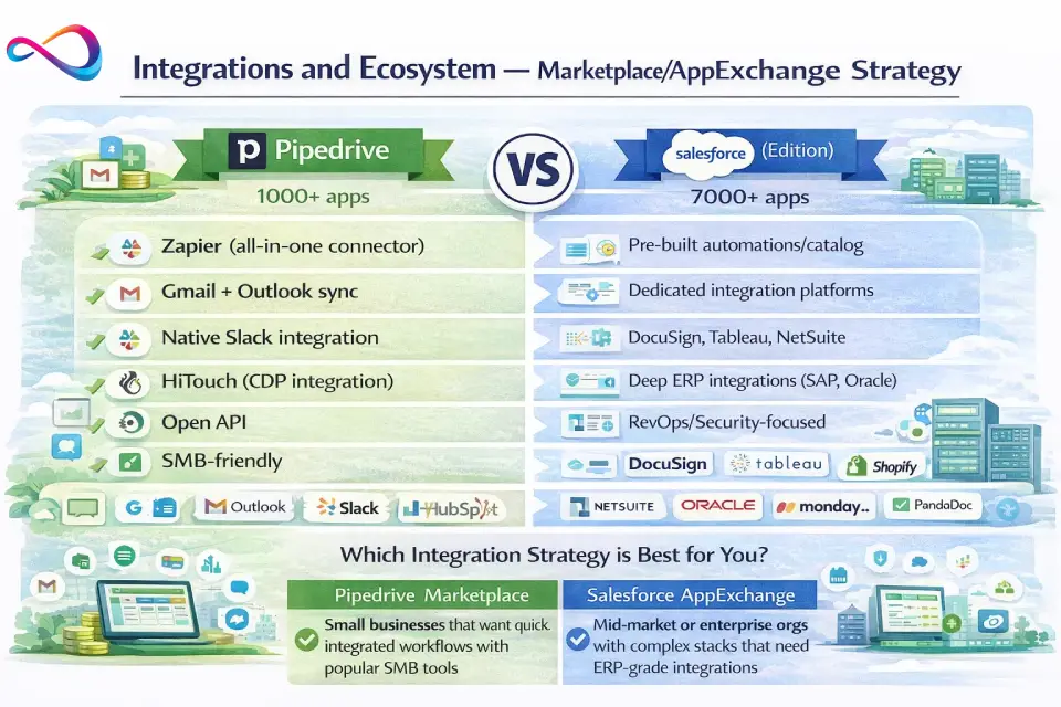 Salesforce’s AppExchange has 7,000+ apps versus Pipedrive’s 500+ Marketplace apps. But integration count isn’t the right metric — evaluate the specific tools in your stack. Both integrate natively with Gmail, Outlook, Slack, and most common business tools. Pipedrive + Zapier covers most SMB integration needs.