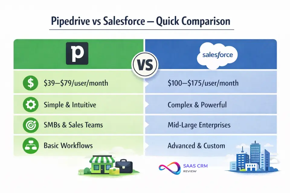 Pipedrive vs Salesforce is a choice between a fast, sales-first CRM and a highly configurable platform built for complex, multi-team workflows. In this 2026 review, we compare pricing and TCO, automation, reporting, integrations, and AI—then map each product to real buying scenarios so you can confidently choose what fits your sales motion and budget.