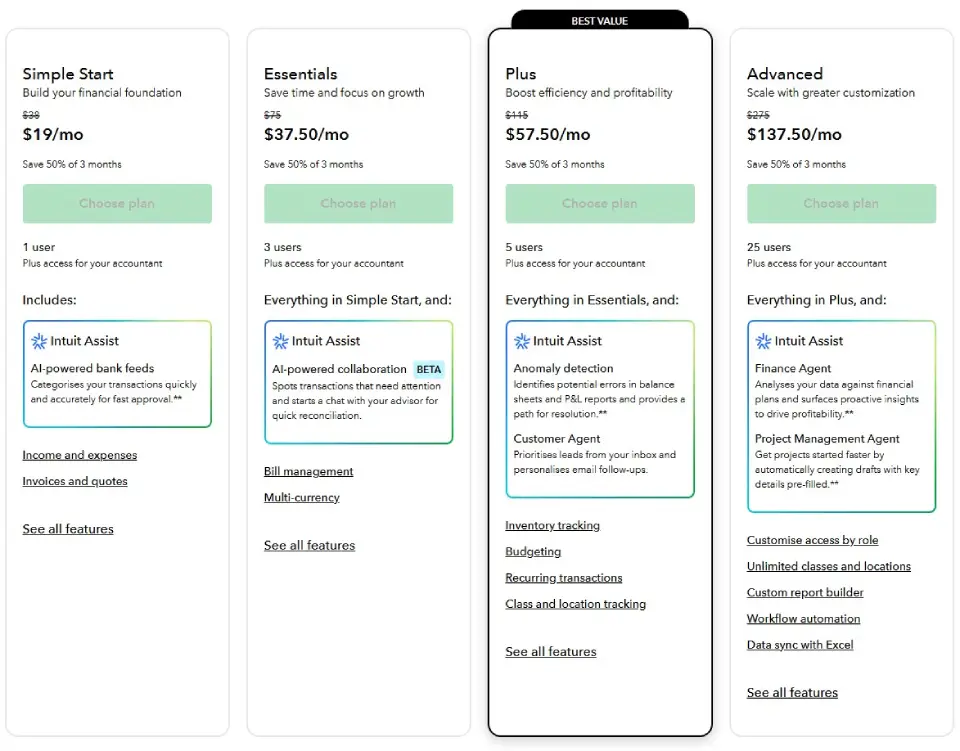 Start with the Plus plan if you need inventory or project tracking. Choose Essentials if you just need solid accounting with bill payment and multiple users. Only choose Simple Start if you’re truly a solo operation with minimal complexity.