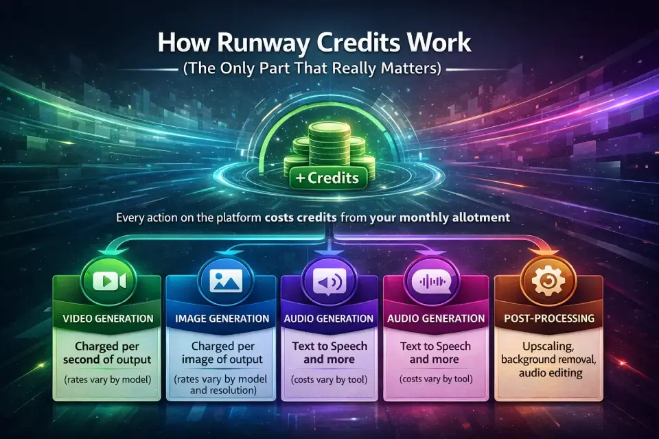 Runway’s credit system is the core mechanism that determines your actual cost. Every generation — video, image, audio, or post-processing — deducts credits from your monthly allotment.