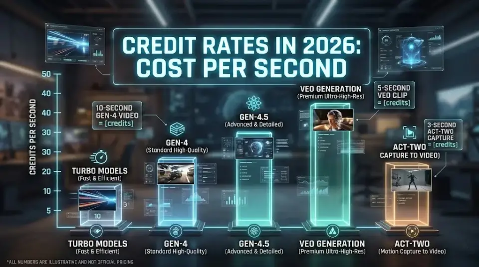 Credit Rates in 2026: Cost Per Second (Gen-4.5, Gen-4, Turbo, Veo, Act-Two)