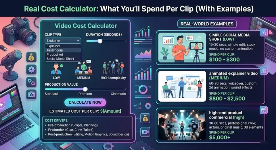 - Production scenario modeling: Real-world output estimates account for a 3:1 iteration ratio (3 generations per keeper), 4K upscale passes on final deliverables, and audio post-production costs.