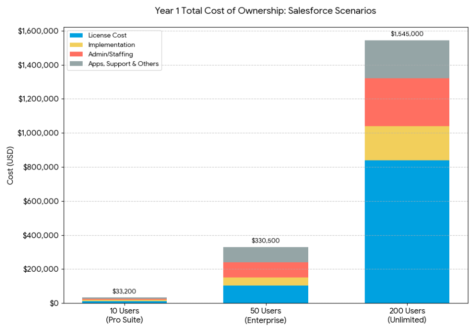 Beyond licenses: implementation ($5K–$500K+), admin staff ($70K–$250K+/yr), AppExchange apps ($5–$100+/user/mo), Premier Support (~30%), storage/sandboxes, integration tools, and training. A 50-user Enterprise deployment typically runs $285,000–$330,000+/year all-in.