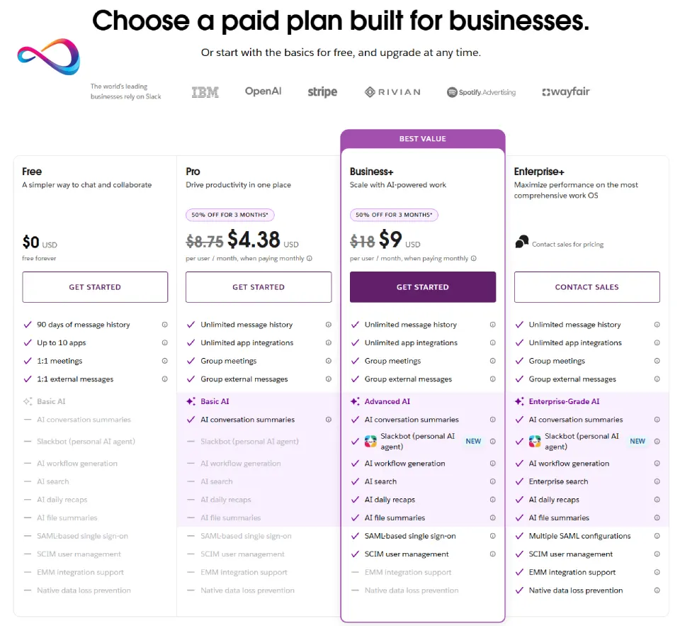 • AI features bundled into all paid plans. The standalone Slack AI add-on (previously ~$10/user/month) was discontinued. Basic AI features (conversation summaries, huddle notes) are now included in Pro. Advanced AI (search, recaps, translations, file summaries, AI workflow generation) is included in Business+.