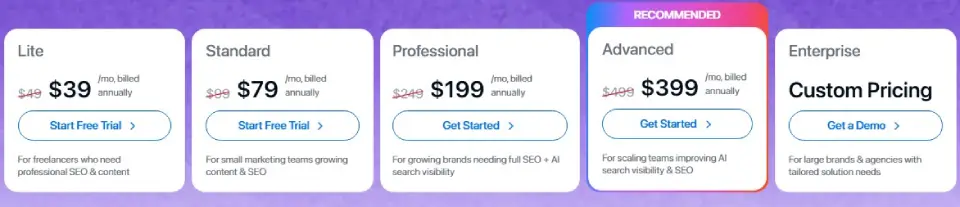 - Choose Professional/Advanced if your goal includes AI Search visibility (e.g., ChatGPT, Perplexity, Google AI Overviews).