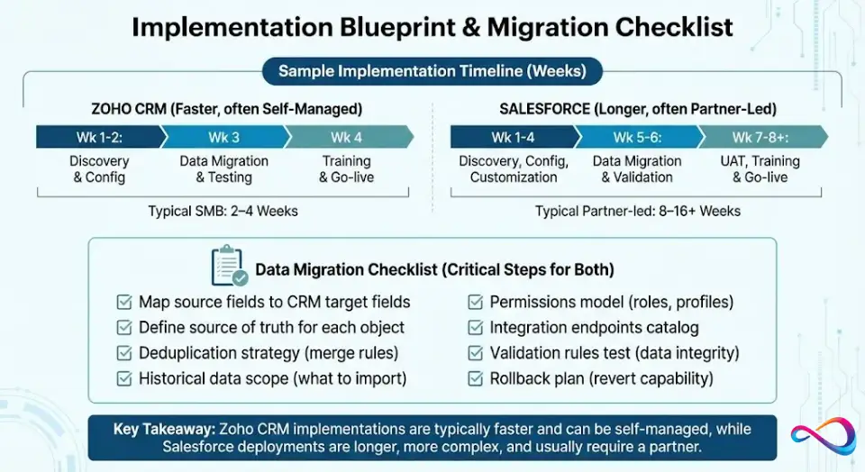 Most CRM comparisons skip implementation — but this is where projects succeed or fail. Below is a practical timeline and data migration checklist you can adapt for either platform.